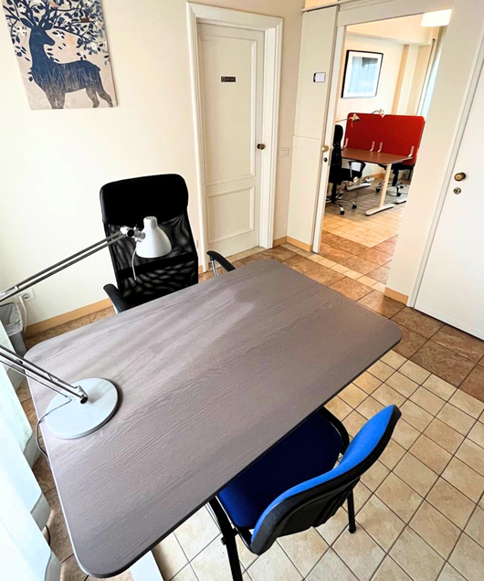 Postazione Scrivania in openspace condiviso dotata sedia ergonomica, wifi in coworking moderno appena ristrutturato.
